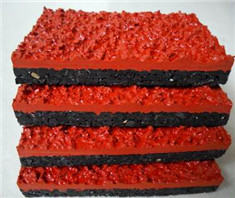采用國際田聯(lián)認可的復合結構,上層為PU顆?;駿PDM耐候性環(huán)保彩色顆粒,滲水的聚氨脂密封,下層采用機械施工緩沖底墊。符合國際比賽標準。標準厚度13mm。