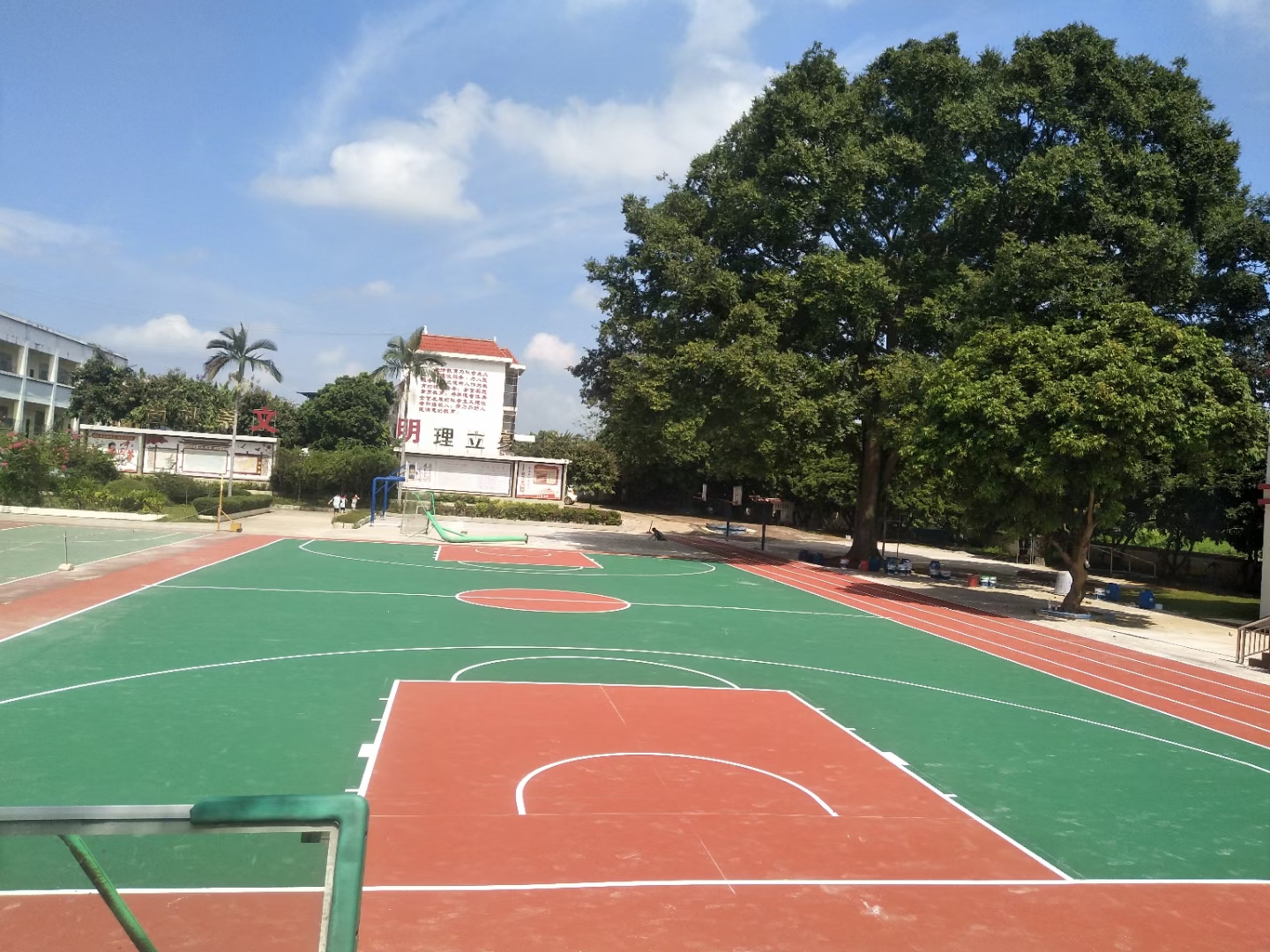 9,劃線:用雙組份納米硅PU白線漆畫標準球場界線,用美紋膠紙按線緊粘在地面上,防止毛邊,用刷子直接刷涂料2層,第二層待第一層干后涂刷。硅PU籃球場施工